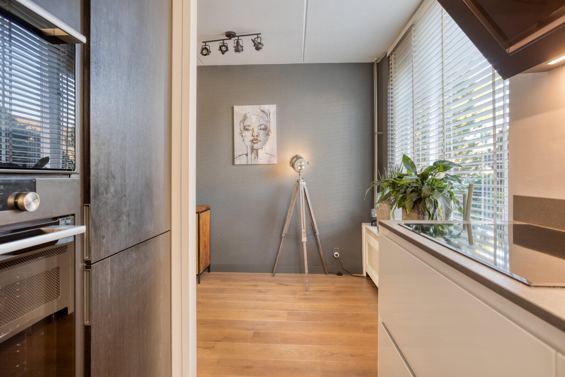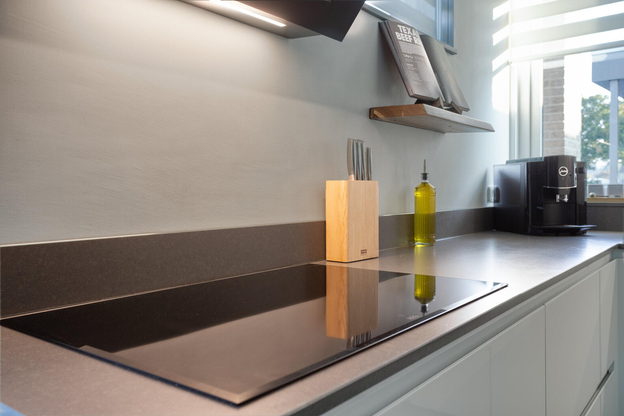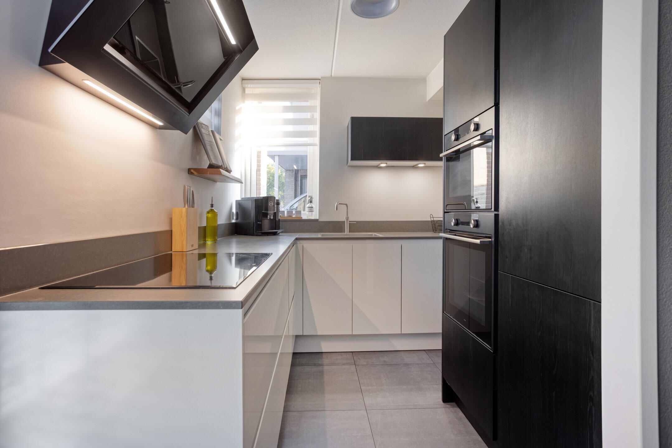 Aan de voorzijde is de keuken gepositioneerd. Hier is effectief gebruik gemaakt van de ruimte met deze maatwerk inrichting uit 2020 in trendy kleurstelling. Voorzien van ingebouwde inductie kookplaat, afzuigkap, vaatwasser, oven, combi-oven, koel-vriescombinatie en een Quooker.