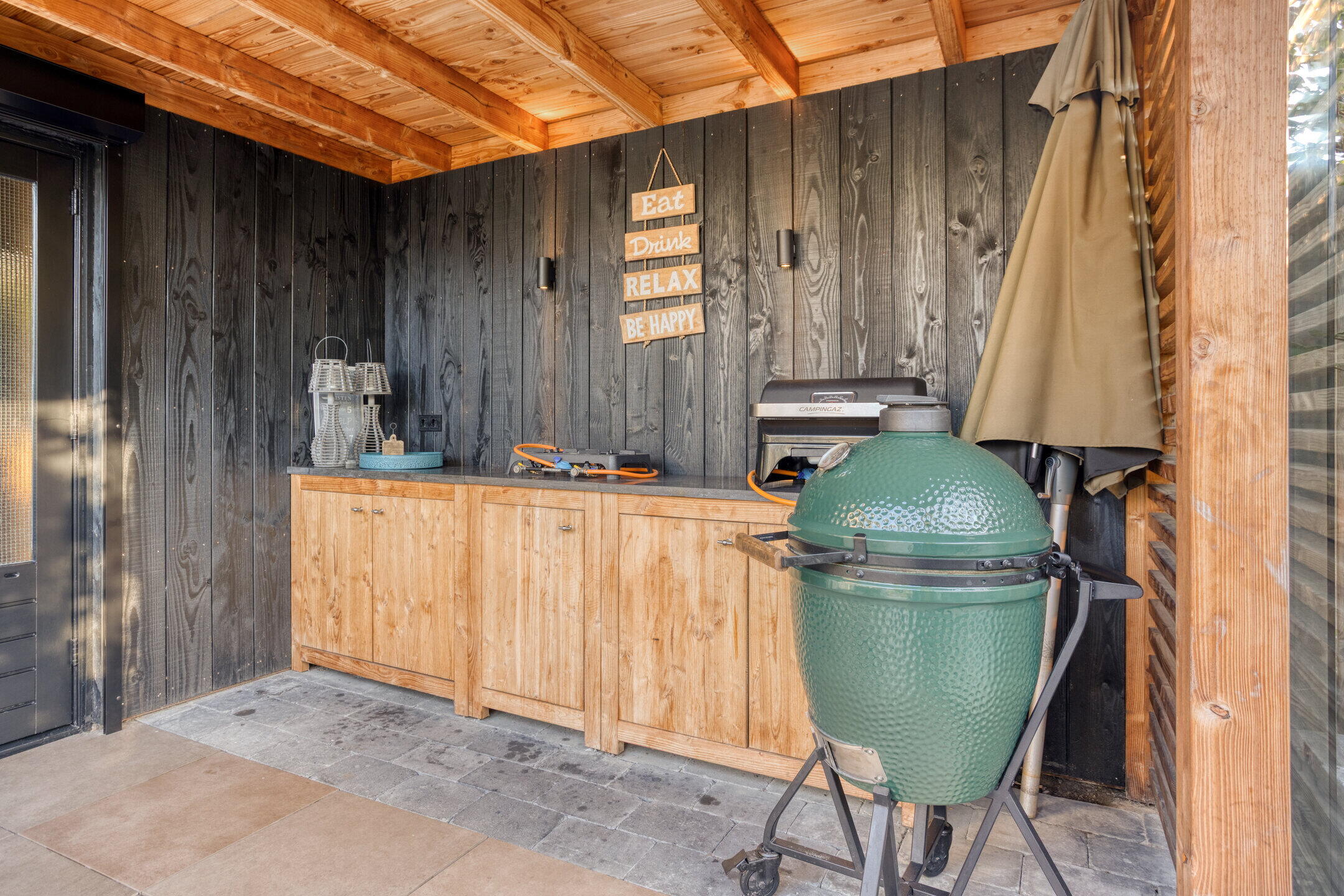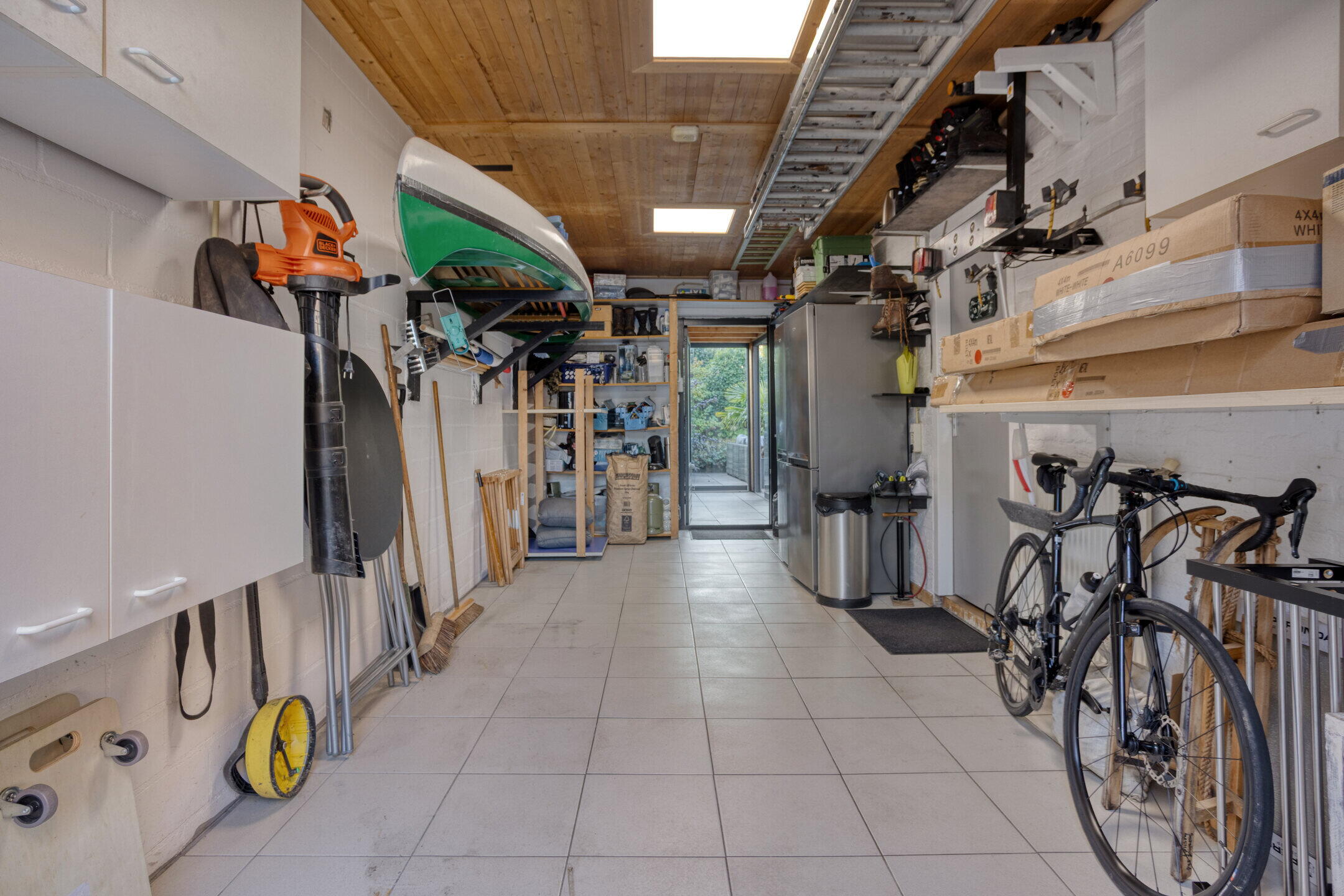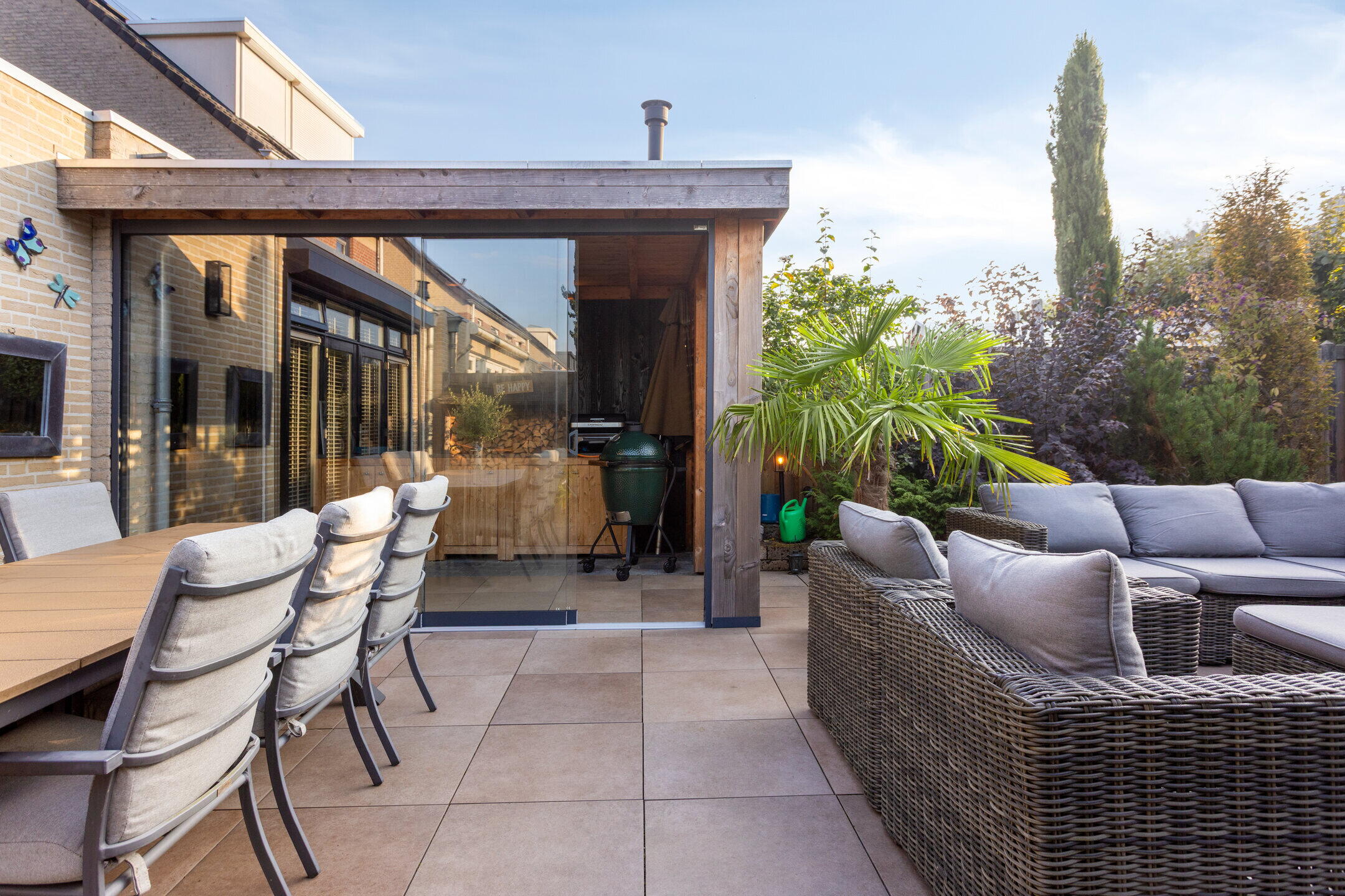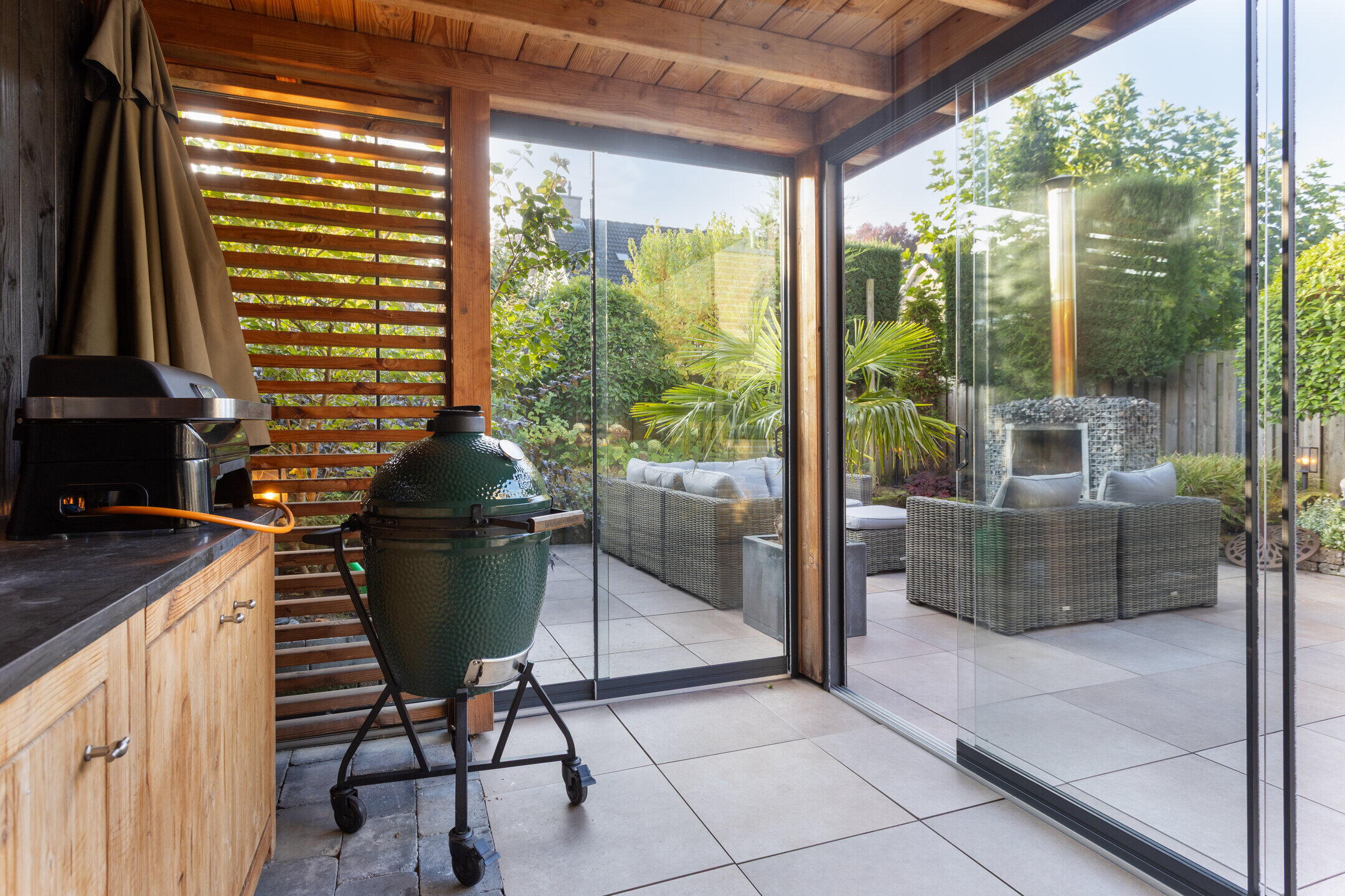 Vanuit de uitbouw is via een gang, die tevens dienst doet als provisieruimte, de inpandige garage bereikbaar. De garage is keurig afgewerkt met een plavuizenvloer en natuurlijk is er elektriciteit. Aansluitend de tuinkamer (terrasoverkapping met glazen schuifwand) die dienst doet als buitenkeuken.