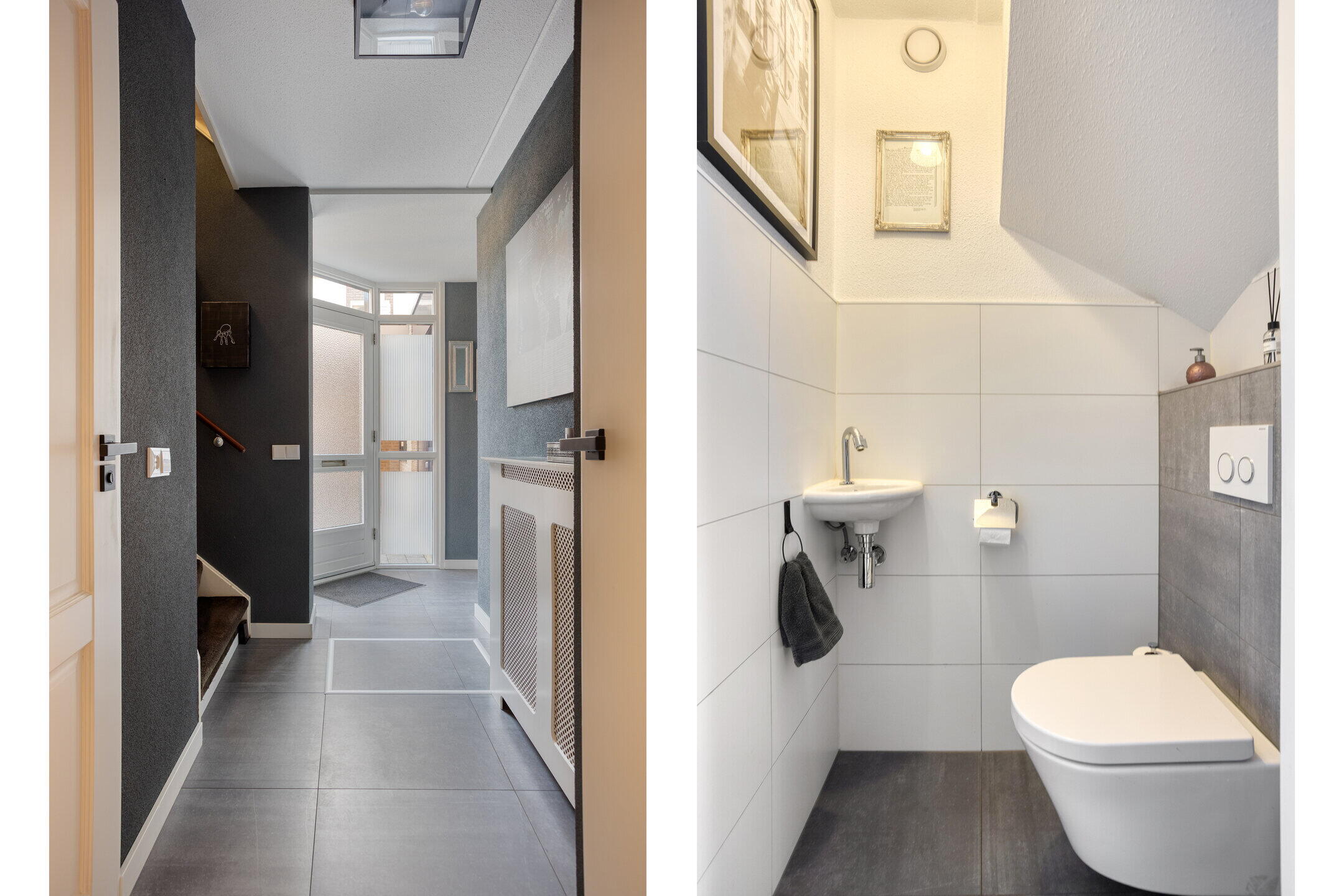 Begane grond: ruime entree; hal met garderobe, meterkast en modern toilet met hangend closet en fonteintje.