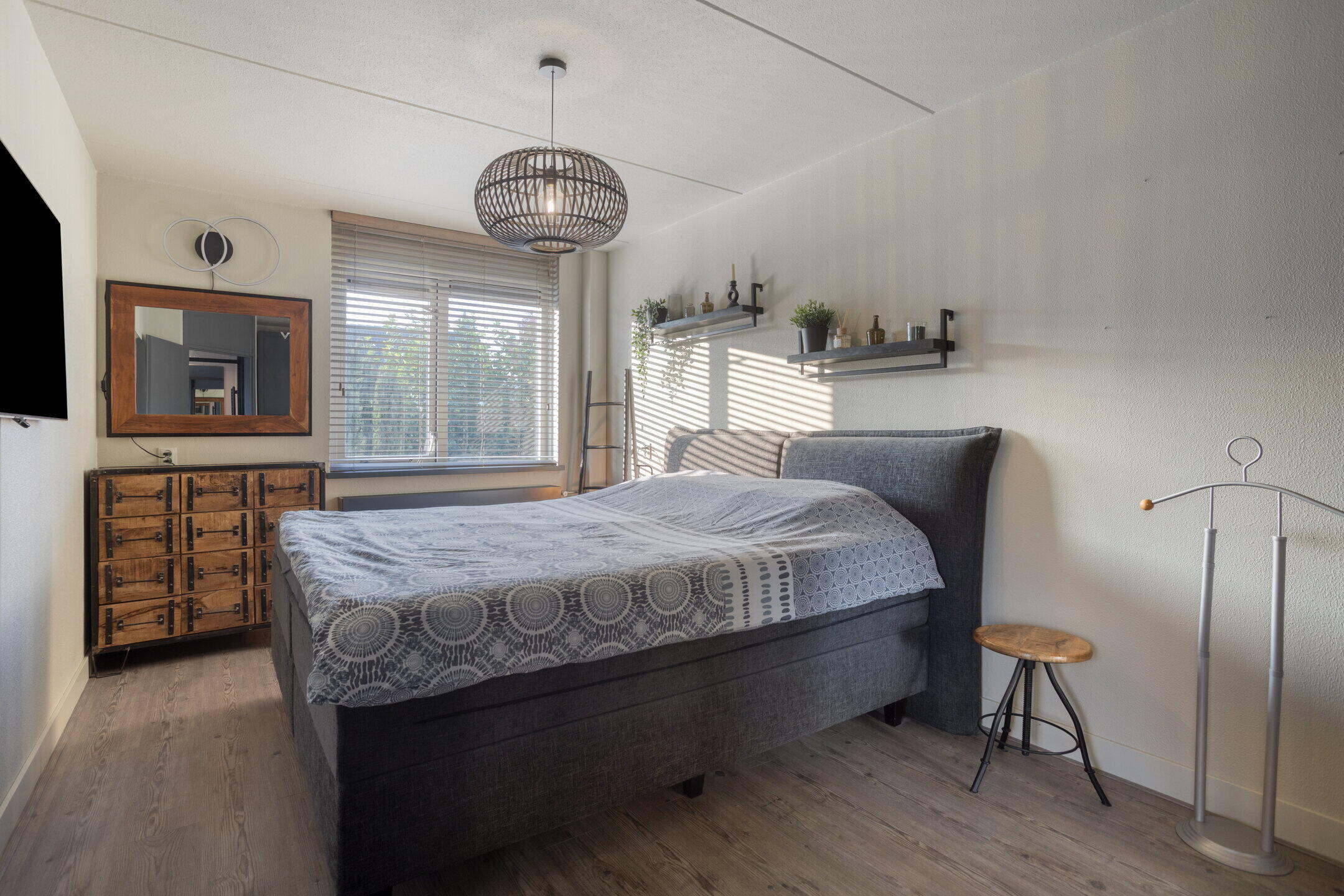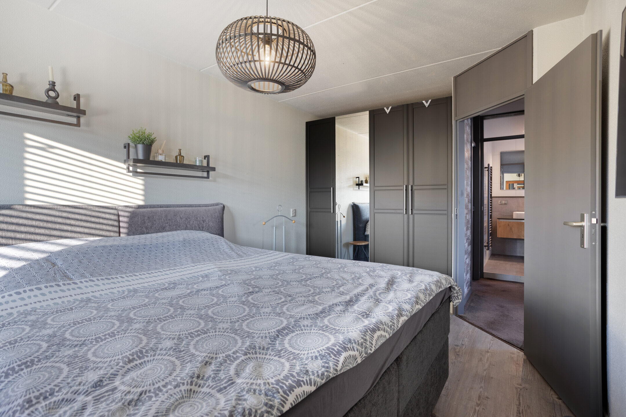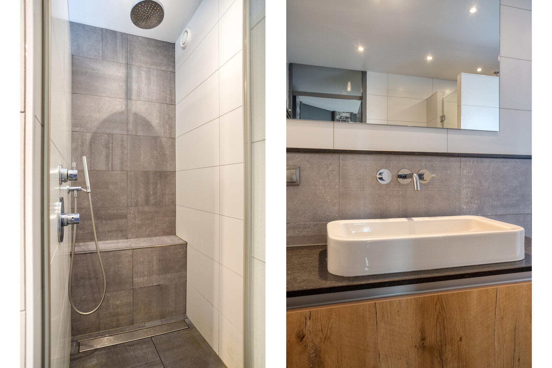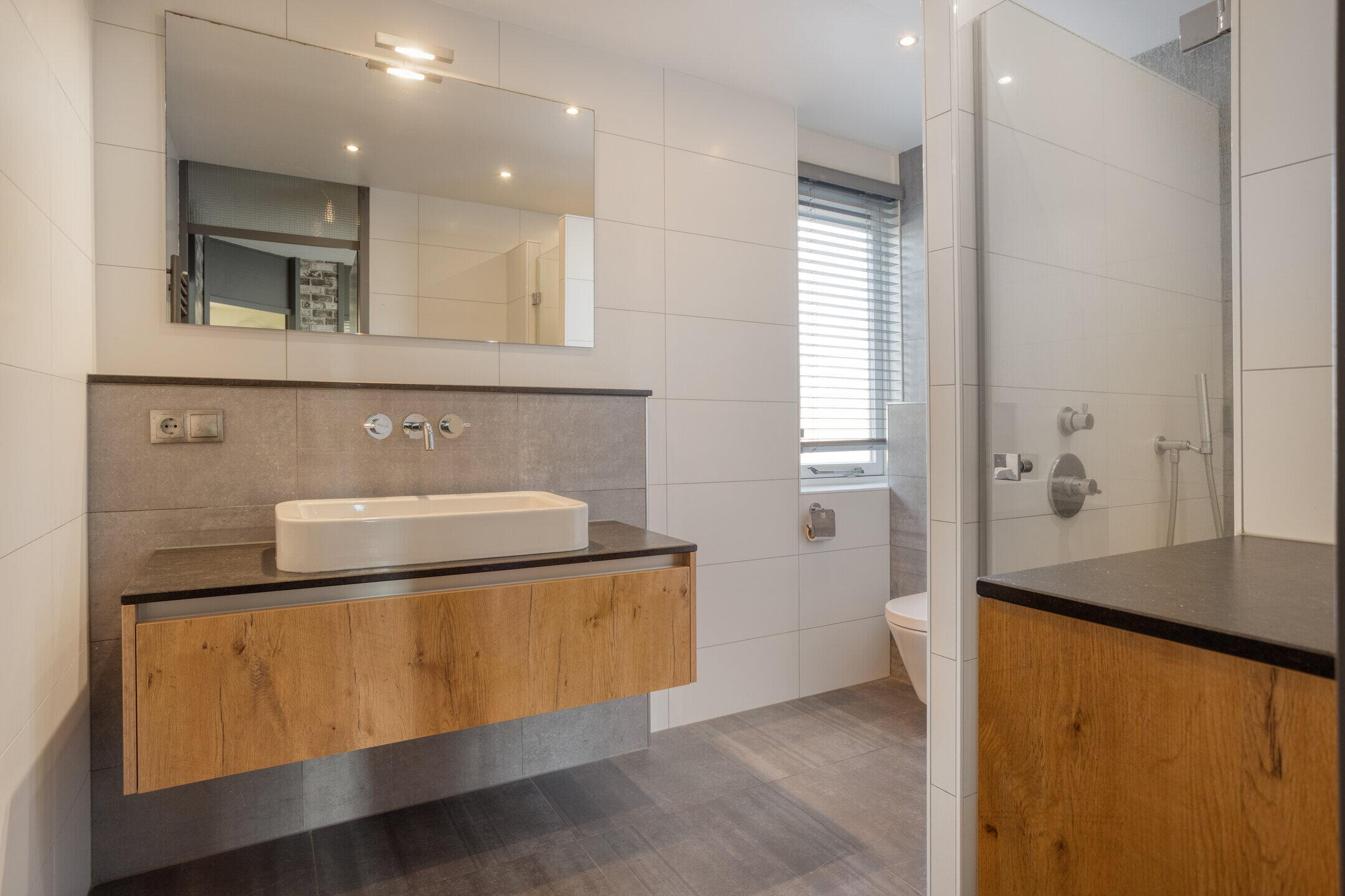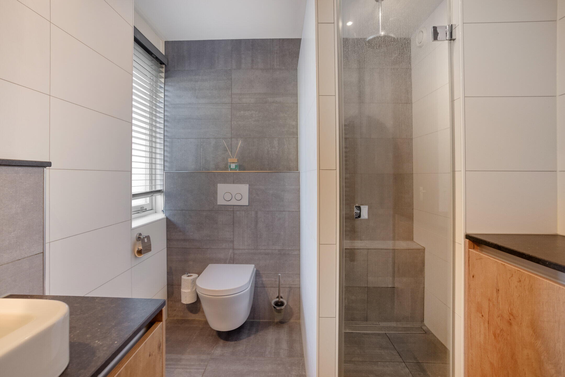 Eerste verdieping: overloop; drie slaapkamers variërend van 6, 8 tot ruim 14 m². De badkamer is met recht luxe te noemen met een inloopdouche met drain en zitmogelijkheid, een wastafelmeubel én een tweede hangend toilet, tevens is er een extra (handdoeken)kast.
