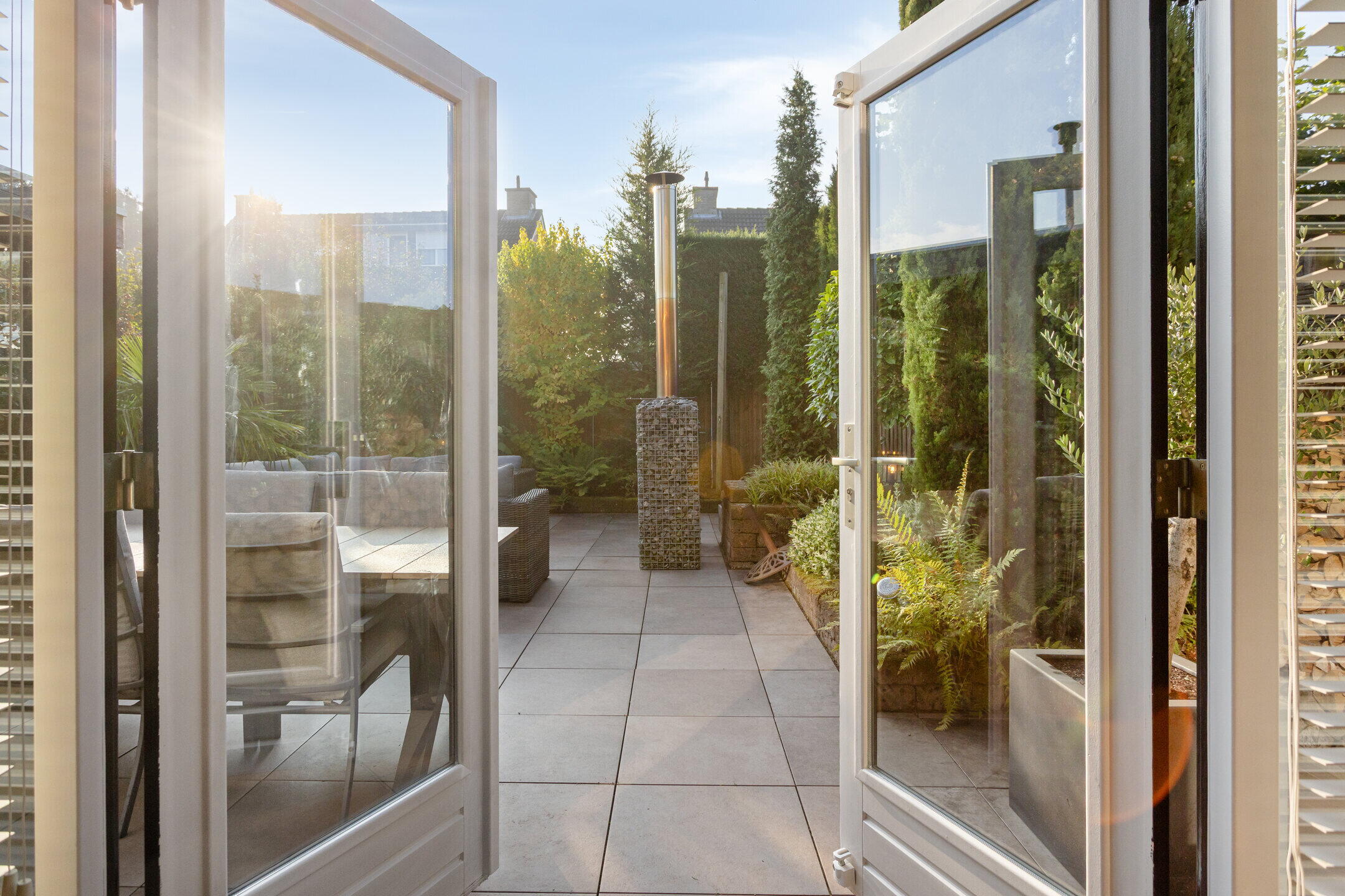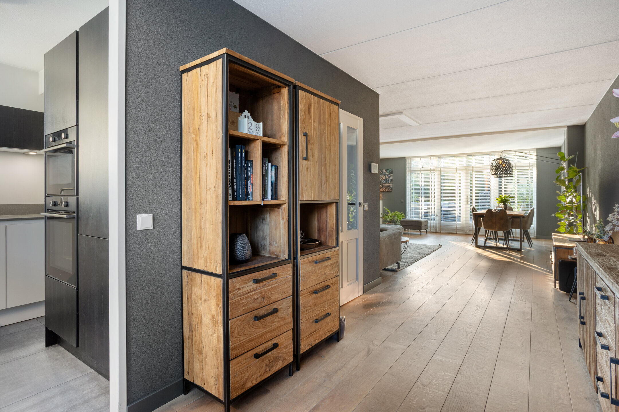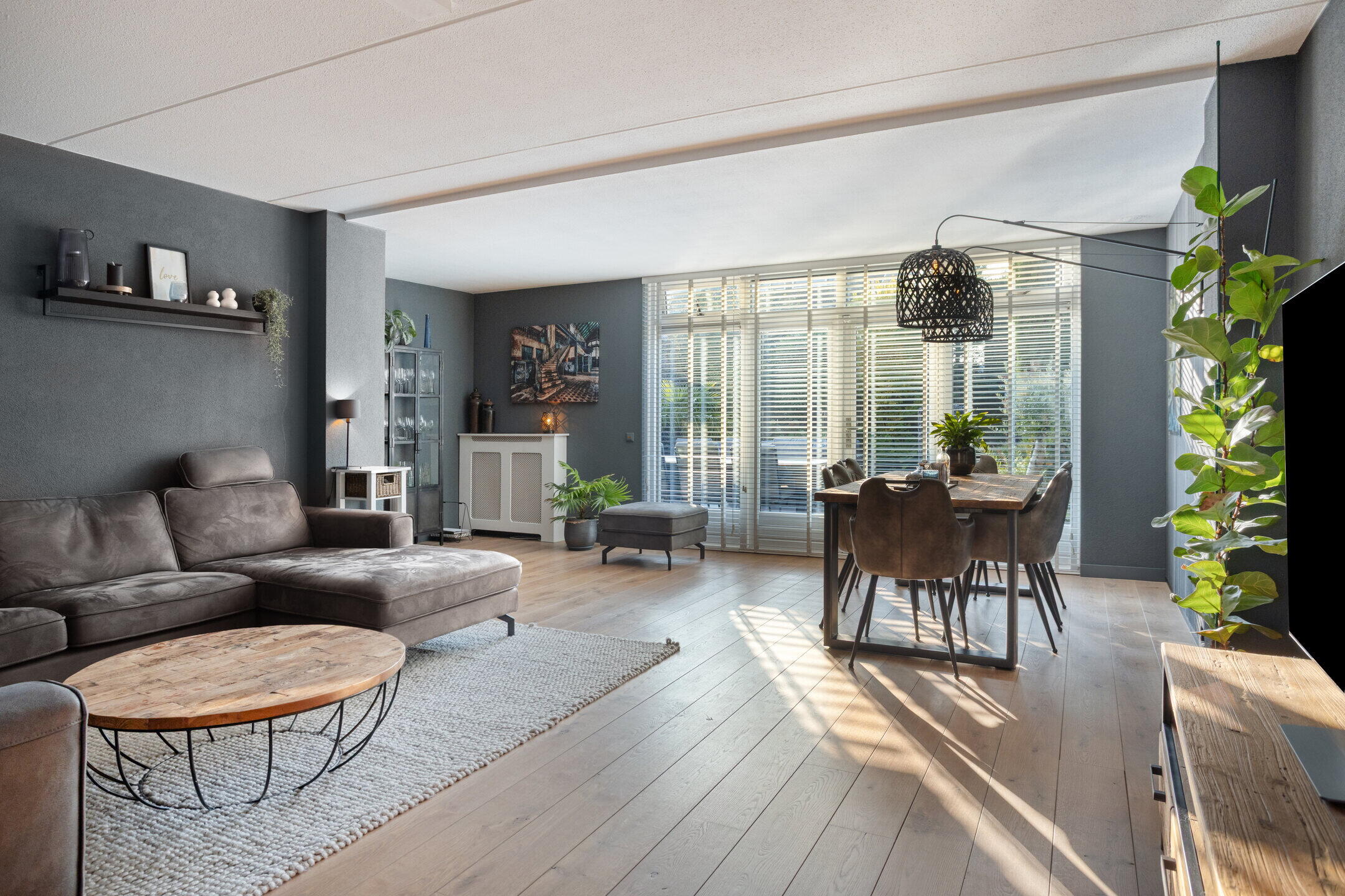 De woning is over de volle breedte uitgebouwd waardoor er een riante tuingerichte living is ontstaan. Meer dan voldoende ruimte voor een grote zithoek en een lange eettafel. Afgewerkt met massief eikenvloer en voorzien van openslaande deuren naar het zonnige terras.