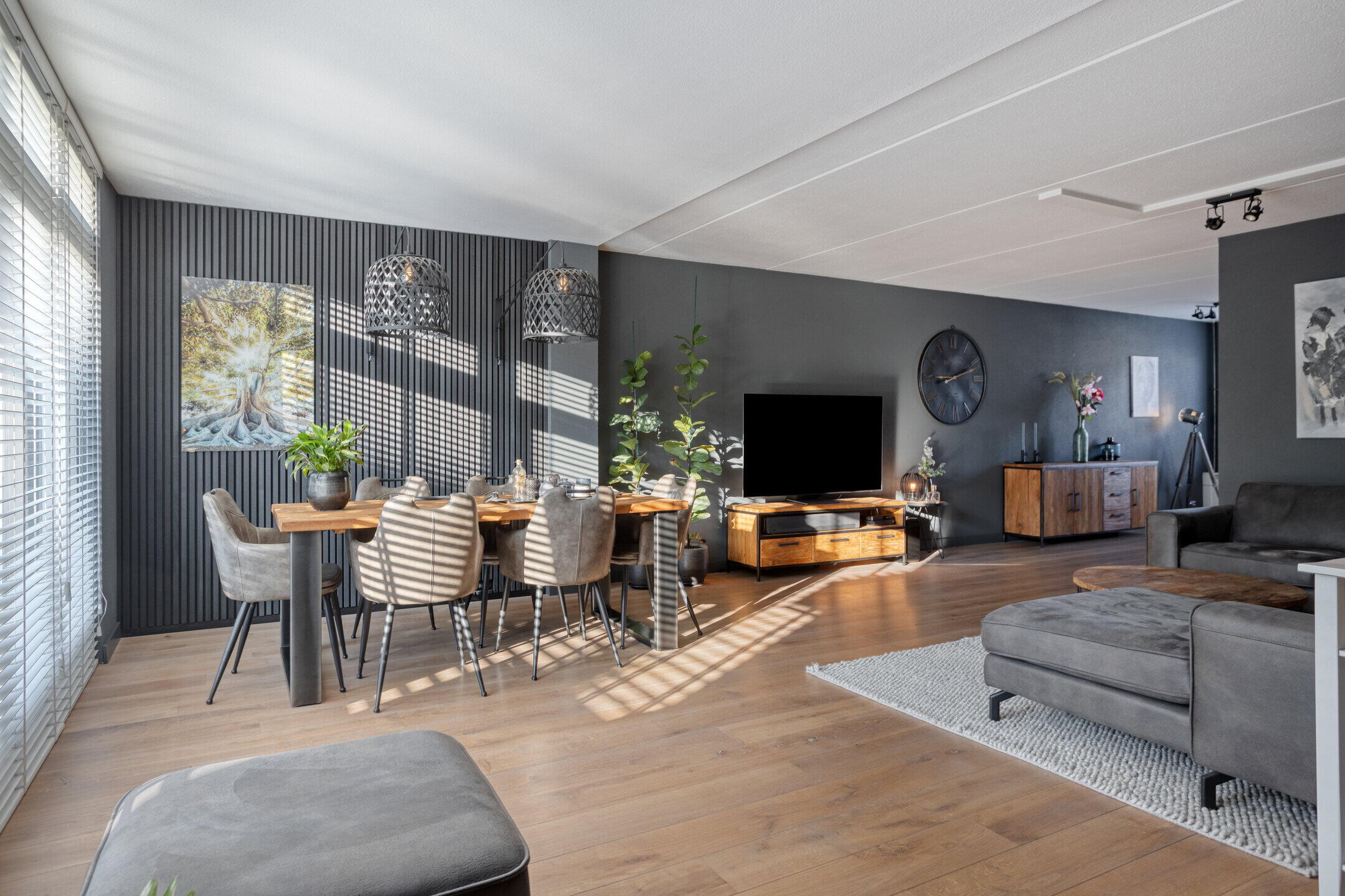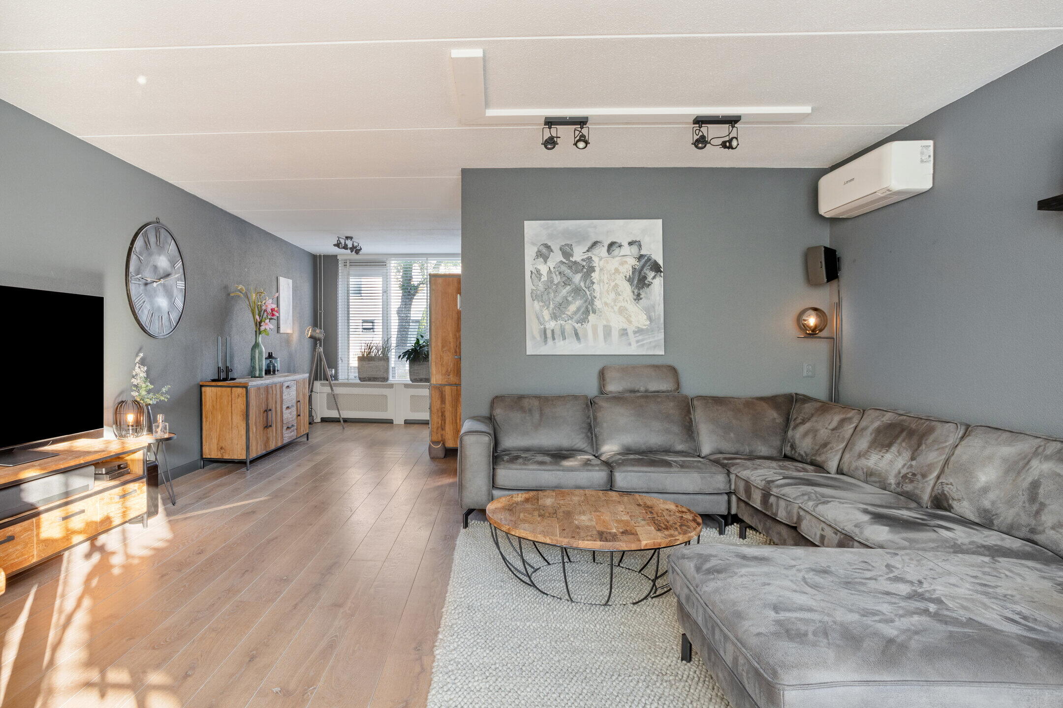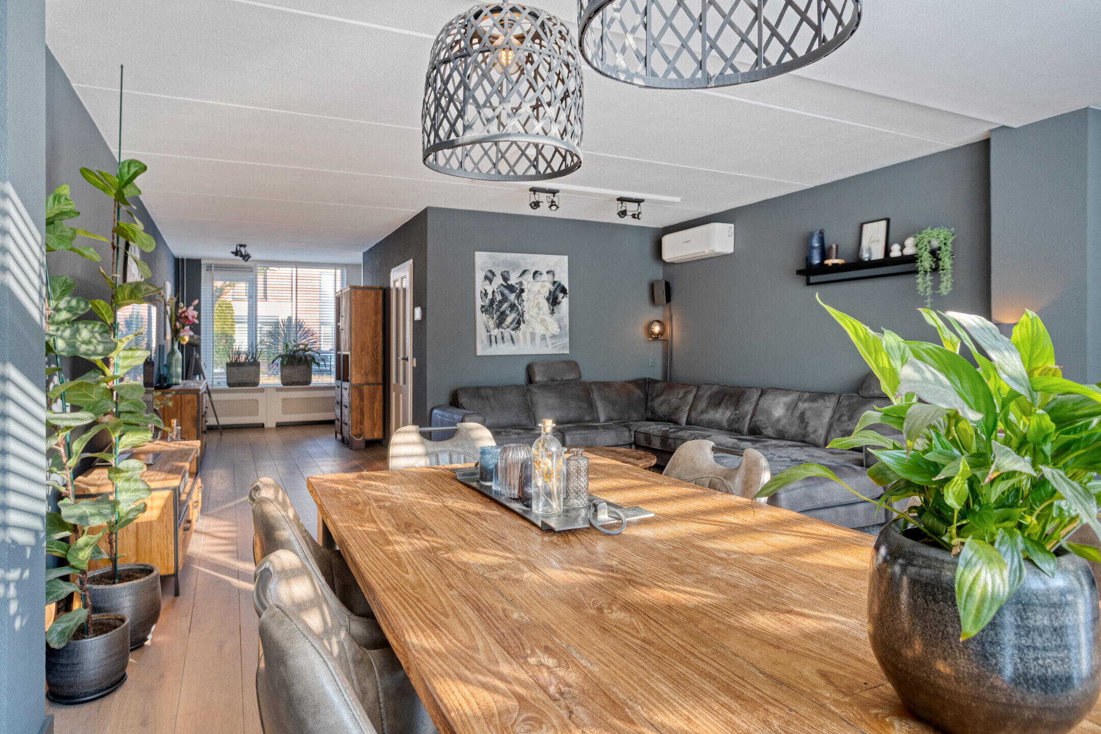 De woning is over de volle breedte uitgebouwd waardoor er een riante tuingerichte living is ontstaan. Meer dan voldoende ruimte voor een grote zithoek en een lange eettafel. Afgewerkt met massief eikenvloer en voorzien van openslaande deuren naar het zonnige terras.