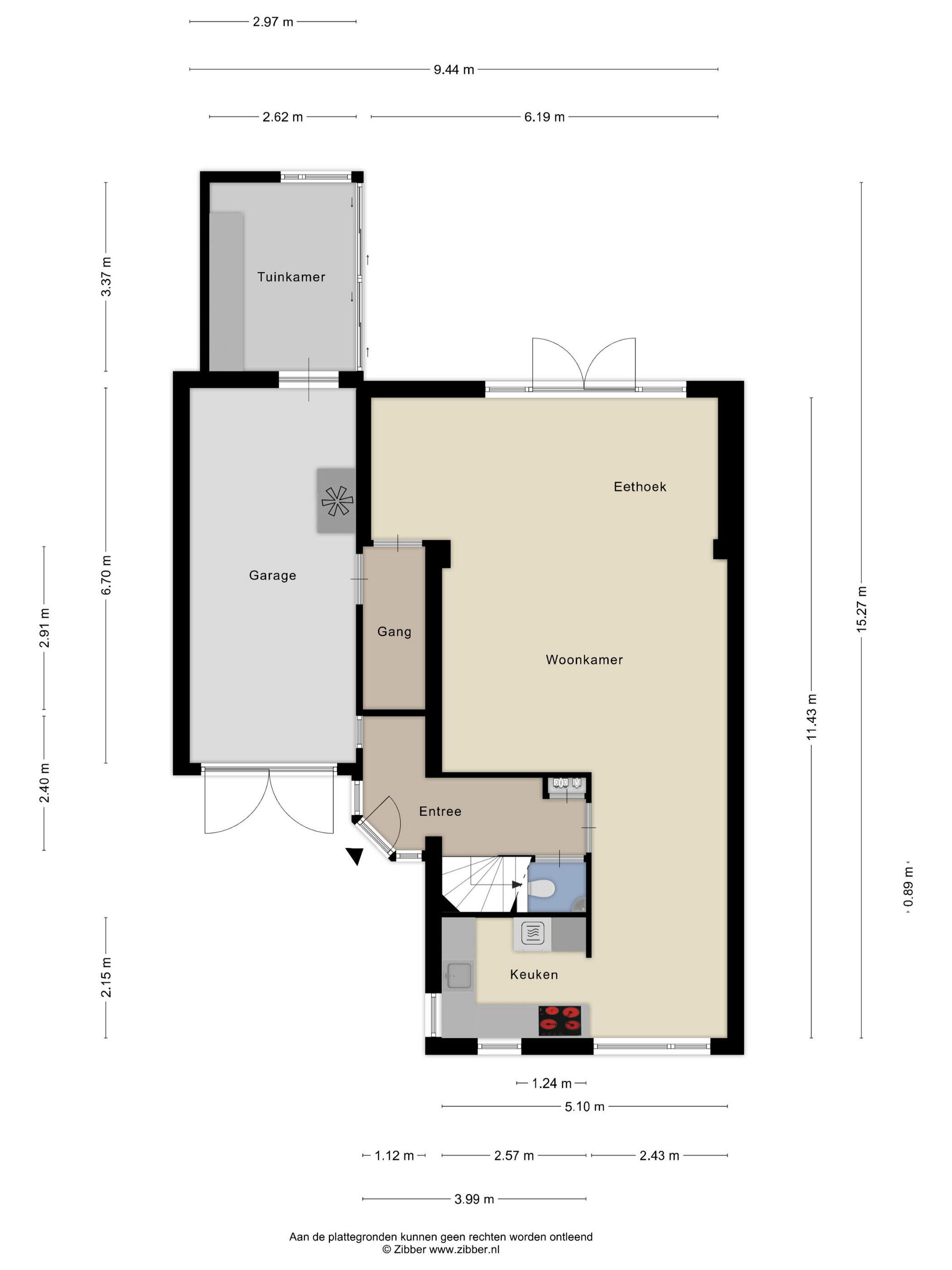 - 102 m² (10.5 meter diep en 9.7 meter breed)